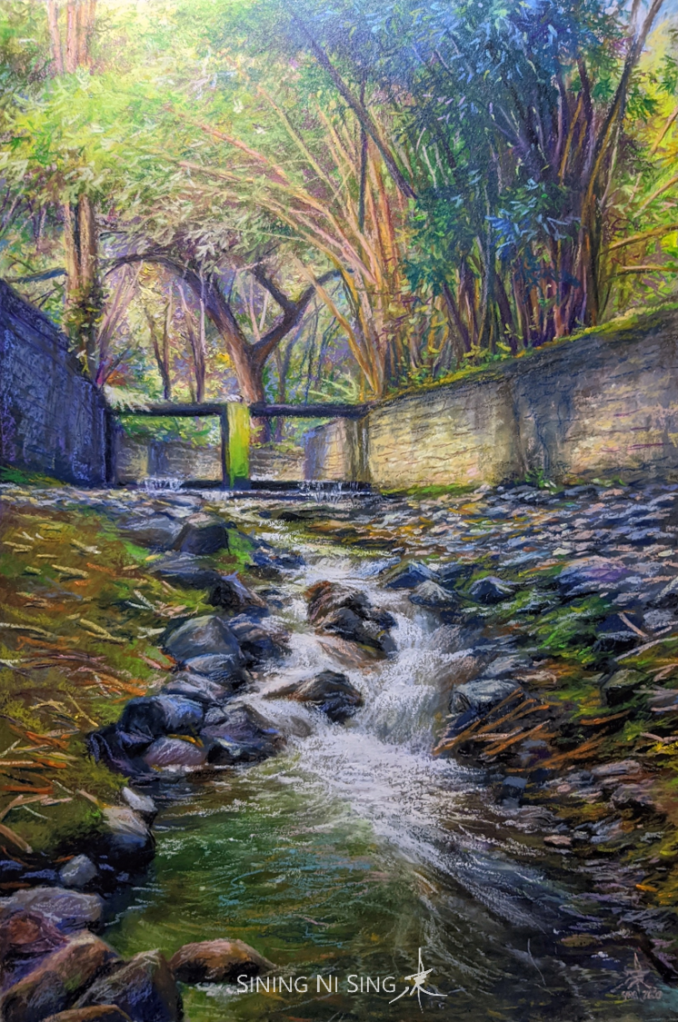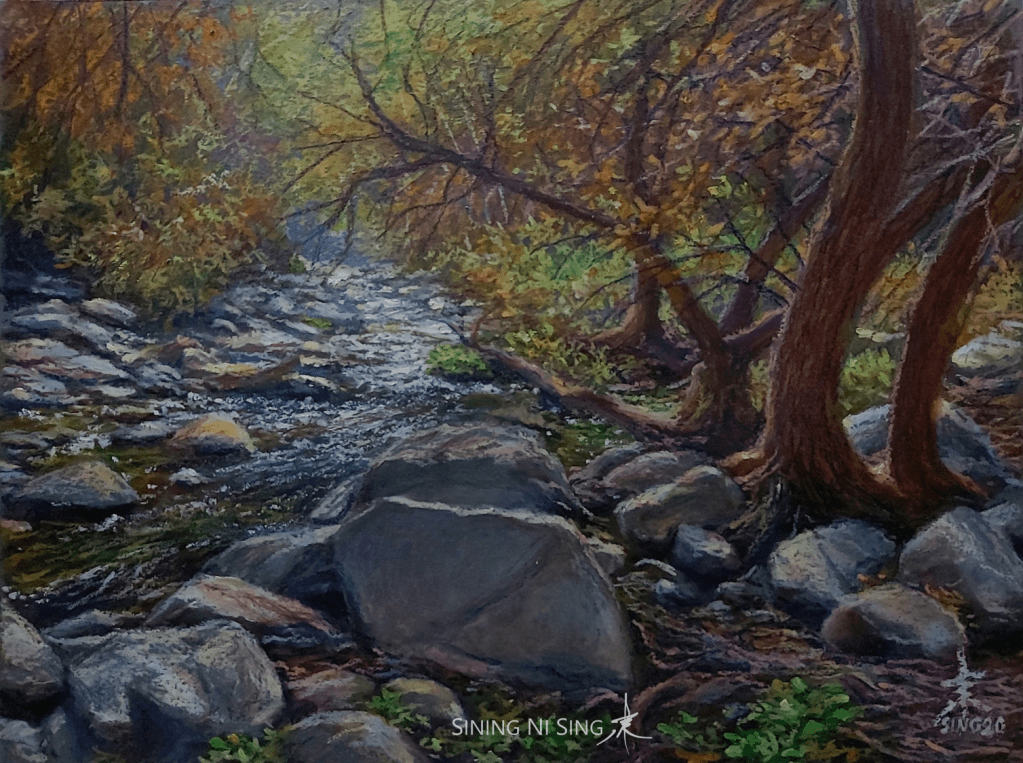 A sample landscape I made using oil pastels and Sir Norbing’s technique. This piece was part of the top five entries in a Let’s Paint Group monthly challenge. (Click to see full image)